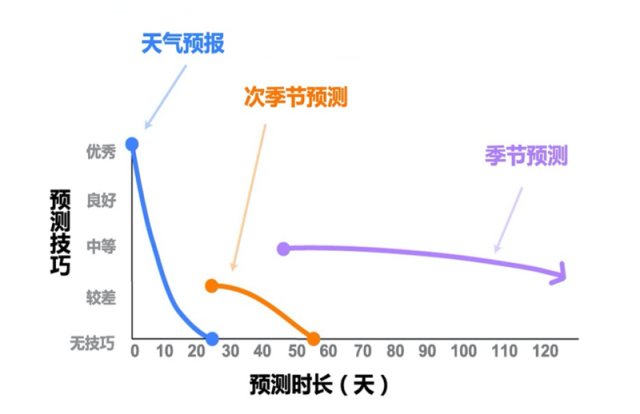 圖為天氣預報和次季節(jié)預測的區(qū)別示意。
