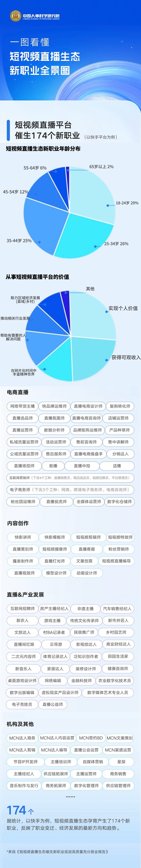中國人事科學(xué)研究院近期發(fā)布的《短視頻直播生態(tài)催生新職業(yè)促進(jìn)高質(zhì)量充分就業(yè)報(bào)告》顯示,一塊屏幕背后發(fā)生了諸多變化:中青年成短視頻直播生態(tài)新職業(yè)的主力軍。其中,18-24歲占29%,25-34歲占26%,35-44歲占25%。18-34歲占比達(dá)到55%?!吨腥A人民共和國職業(yè)分類大典(2022年版)》的1639個(gè)職業(yè)中,短視頻平臺(tái)快手覆蓋八成以上的數(shù)字職業(yè),為勞動(dòng)者提供了更廣闊的職業(yè)發(fā)展空間。