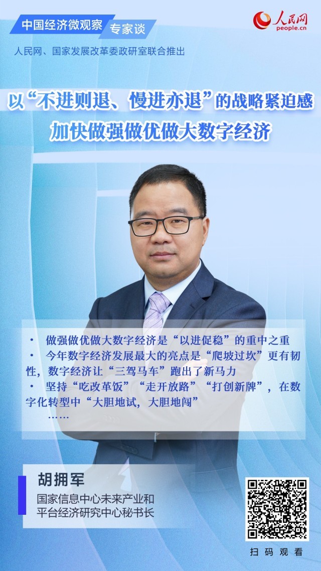近日,國家信息中心未來產(chǎn)業(yè)和平臺經(jīng)濟研究中心秘書長胡擁軍做客《中國經(jīng)濟微觀察·專家談》欄目時表示,“以進促穩(wěn)”是中央經(jīng)濟工作會議釋放的最鮮明的積極信號之一,從經(jīng)濟回升向好的趨勢、潛力、基礎來看,做強做優(yōu)做大數(shù)字經(jīng)濟是“以進促穩(wěn)”的重中之重。