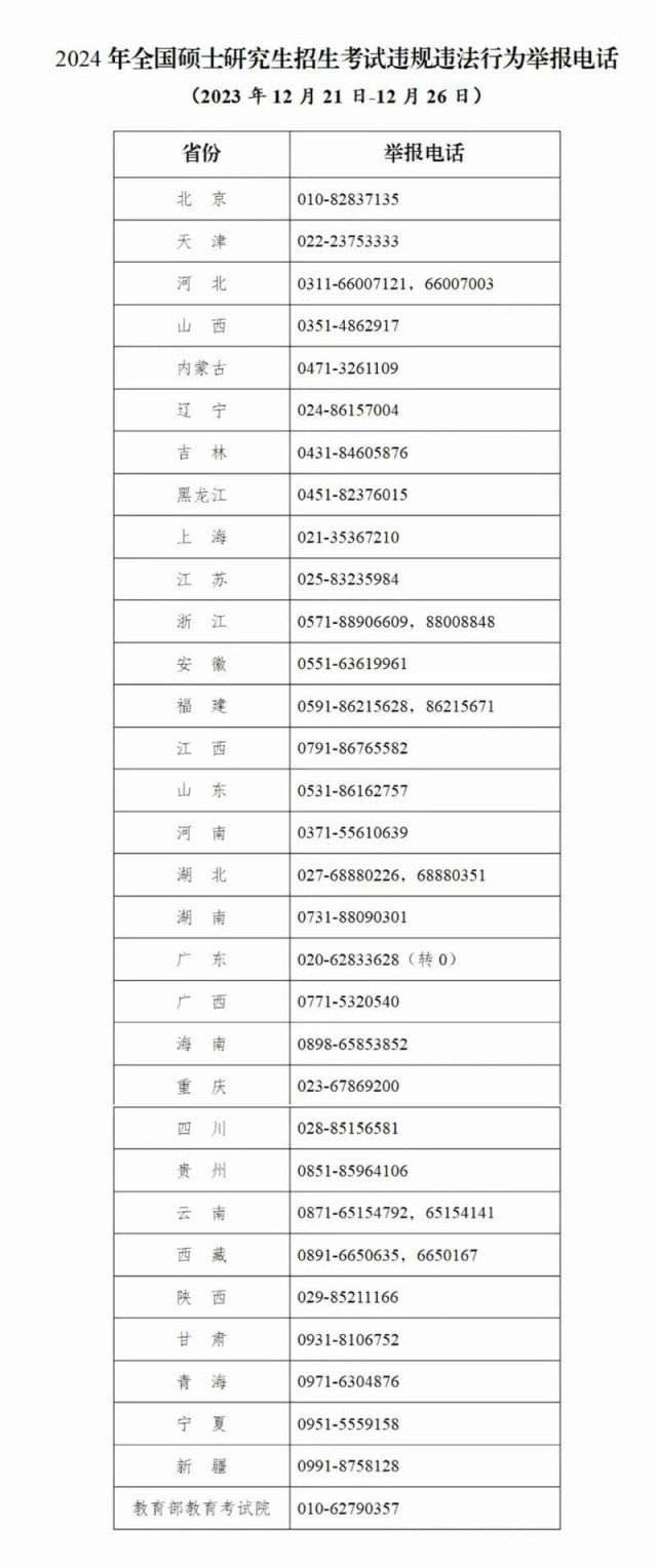 教育部和各省(區(qū)、市)教育招生考試機構將開通2024年研考舉報電話,考生及社會各界人士可及時舉報反映有關問題線索。教育部及各?。▍^(qū)、市)將會同有關部門根據(jù)舉報線索第一時間核查處理,堅決維護風清氣正的研考環(huán)境。