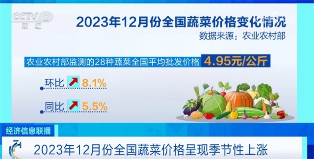 央視網(wǎng)消息:來關注“菜籃子”價格。農(nóng)業(yè)農(nóng)村部最新數(shù)據(jù)顯示,2023年12月份全國菜籃子指數(shù)為123.32,環(huán)比上漲6.89個點,蔬菜價格呈現(xiàn)季節(jié)性上漲。