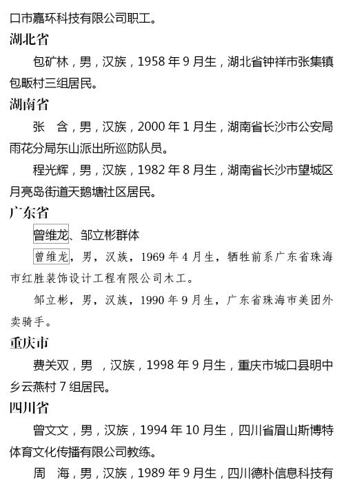上榜勇士中有勇斗持刀犯罪嫌疑人身負(fù)重傷的張照杰、姚玉龍、王沖、王永芳;有從高橋跳水救人的周中磊、曾文文、周海;有從隨時可能爆炸的事故車輛中救出司機母子的湯益鑫;有冒著煤氣罐爆炸危險制服劫持孩子歹徒的蔡國榮;有救援被困電梯內(nèi)同事而導(dǎo)致左小腿截肢的翟元敏;有休假期間水下連續(xù)救人的現(xiàn)役軍人柯東賢、吳金學(xué)、趙錦雄;更有見義勇為英勇犧牲的李偉倫、張嘉俊、張可可、李峰武、安西德、何同猛、曾維龍、胡喜明、李振華、東周才仁、賽西陳文11位同志,讓我們深懷敬仰,致崇高敬意!勇士們見義勇為事跡鼓舞人心、振奮精神、催人奮進。他們用血汗甚至生命秉承、詮釋了中華民族傳統(tǒng)美德,用奮不顧身的實際行動踐行了社會主義核心價值觀。