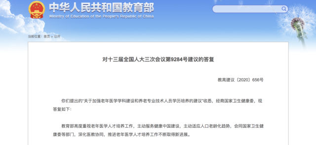早在2021年,教育部官網(wǎng)曾公布《對十三屆全國人大三次會議第9284號建議的答復(fù)》,下一步,教育部將進(jìn)一步加強(qiáng)面向全體醫(yī)學(xué)類專業(yè)學(xué)生開展老年醫(yī)學(xué)教育,同時,協(xié)同國家衛(wèi)生健康委,鼓勵高校加強(qiáng)老年醫(yī)學(xué)學(xué)科建設(shè)、推進(jìn)老年醫(yī)學(xué)專科醫(yī)師規(guī)范化培訓(xùn)。