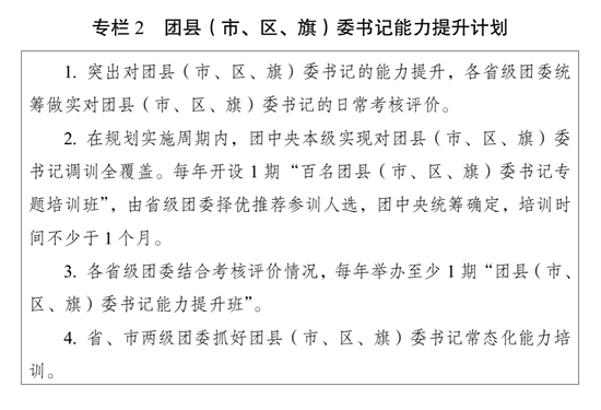 (二)突出“關(guān)鍵少數(shù)”政治訓(xùn)練。堅(jiān)持把政治訓(xùn)練貫穿團(tuán)干部成長(zhǎng)全周期,使團(tuán)干部的政治素養(yǎng)、政治能力與擔(dān)負(fù)的領(lǐng)導(dǎo)職責(zé)相匹配。強(qiáng)化“一把手”政治培訓(xùn),有計(jì)劃地選調(diào)團(tuán)的各級(jí)領(lǐng)導(dǎo)機(jī)關(guān)主要負(fù)責(zé)同志到團(tuán)干部教育培訓(xùn)機(jī)構(gòu)參加專(zhuān)題培訓(xùn)。強(qiáng)化對(duì)團(tuán)縣(市、區(qū)、旗)委書(shū)記這一群體的培訓(xùn),實(shí)施團(tuán)縣(市、區(qū)、旗)委書(shū)記能力提升計(jì)劃(專(zhuān)欄2)。突出對(duì)團(tuán)的領(lǐng)導(dǎo)機(jī)關(guān)干部的政治訓(xùn)練,各級(jí)團(tuán)的領(lǐng)導(dǎo)機(jī)關(guān)加強(qiáng)對(duì)機(jī)關(guān)干部的常態(tài)化政治能力培訓(xùn)。加強(qiáng)對(duì)青年人才的政治引領(lǐng),團(tuán)中央組織部會(huì)同有關(guān)單位每年組織一定數(shù)量青年人才開(kāi)展國(guó)情研修。積極推動(dòng)將地方團(tuán)的領(lǐng)導(dǎo)機(jī)關(guān)班子成員培訓(xùn)納入地方黨委組織開(kāi)展的干部政治理論培訓(xùn)范疇。