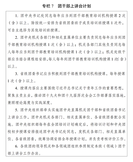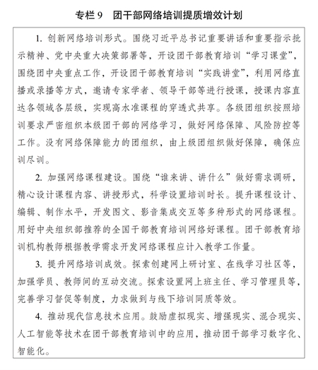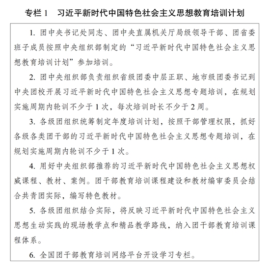 ?。ㄒ唬┚劢咕哿Γ镁脼楣?。完善團(tuán)干部理論教育培訓(xùn)長(zhǎng)效機(jī)制,落實(shí)黨的創(chuàng)新理論學(xué)習(xí)教育計(jì)劃,組織實(shí)施習(xí)近平新時(shí)代中國(guó)特色社會(huì)主義思想教育培訓(xùn)計(jì)劃(專(zhuān)欄1),系統(tǒng)謀劃、持續(xù)用力,不斷把思想鑄魂、理論武裝工作引向深入。堅(jiān)持把習(xí)近平新時(shí)代中國(guó)特色社會(huì)主義思想作為團(tuán)的各級(jí)領(lǐng)導(dǎo)機(jī)關(guān)班子成員理論學(xué)習(xí)中心組學(xué)習(xí)首要內(nèi)容,作出具體安排、精心組織實(shí)施;作為各級(jí)團(tuán)干部教育培訓(xùn)機(jī)構(gòu)的主課必修課,辦好理論進(jìn)修班、理論研修班;作為團(tuán)干部學(xué)習(xí)的中心內(nèi)容,全面系統(tǒng)學(xué)、持續(xù)深入學(xué)、聯(lián)系實(shí)際學(xué)。以縣處級(jí)及以上團(tuán)干部為重點(diǎn),開(kāi)展習(xí)近平新時(shí)代中國(guó)特色社會(huì)主義思想和黨的二十大精神集中輪訓(xùn);深入開(kāi)展主題教育,通過(guò)專(zhuān)題學(xué)習(xí)、研討交流、主題黨課、調(diào)查研究、建章立制等形式,推動(dòng)黨的創(chuàng)新理論學(xué)習(xí)教育走深走實(shí)走心,使廣大團(tuán)干部更加深刻領(lǐng)悟“兩個(gè)確立”的決定性意義,更加自覺(jué)增強(qiáng)“四個(gè)意識(shí)”、堅(jiān)定“四個(gè)自信”、做到“兩個(gè)維護(hù)”。深入開(kāi)展習(xí)近平總書(shū)記關(guān)于青年工作的重要思想學(xué)習(xí)培訓(xùn),使廣大團(tuán)干部學(xué)習(xí)掌握黨的青年工作的地位作用、目標(biāo)任務(wù)、職責(zé)使命、實(shí)踐要求,為做好新時(shí)代新征程黨的青年工作打牢思想基礎(chǔ)。