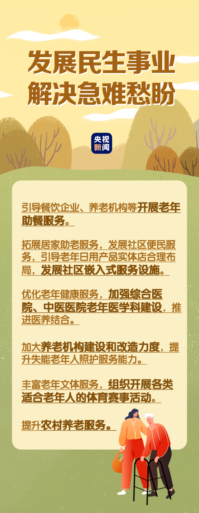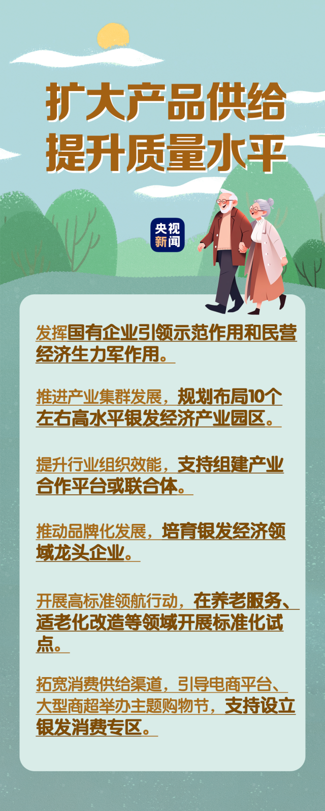 在民生事業(yè)方面,國(guó)家將擴(kuò)大和發(fā)展七方面的服務(wù),包括養(yǎng)老助餐、居家助老、社區(qū)便民、老年健康、養(yǎng)老照護(hù)、老年文體、農(nóng)村養(yǎng)老等方面的服務(wù)。國(guó)務(wù)院辦公廳印發(fā)《關(guān)于發(fā)展銀發(fā)經(jīng)濟(jì)增進(jìn)老年人福祉的意見》中提出了4個(gè)方面舉措,小編根據(jù)文件內(nèi)容進(jìn)行了簡(jiǎn)要梳理,一圖了解“銀發(fā)經(jīng)濟(jì)”核心要點(diǎn)?!?/p>