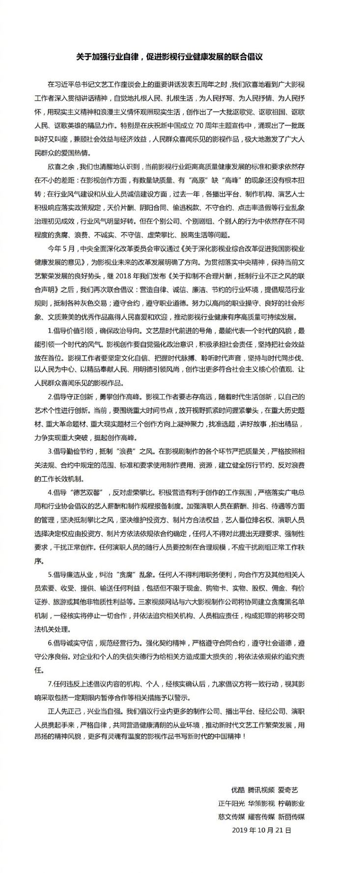 為了避免娛樂圈的爭番、攀比等亂象,業(yè)界公司曾聯(lián)合發(fā)布自律倡議。2019年,優(yōu)酷、騰訊視頻、愛奇藝三家視頻網(wǎng)站,聯(lián)合正午陽光、華策影視、檸萌影業(yè)、慈文傳媒、耀客傳媒、新麗傳媒六大影視制作公司,共同發(fā)布《關(guān)于加強行業(yè)自律,促進影視行業(yè)健康發(fā)展的聯(lián)合倡議》。