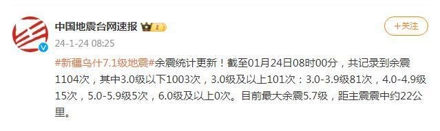 截至24日8時(shí) 新疆烏什7.1級地震共記錄到余震1104次