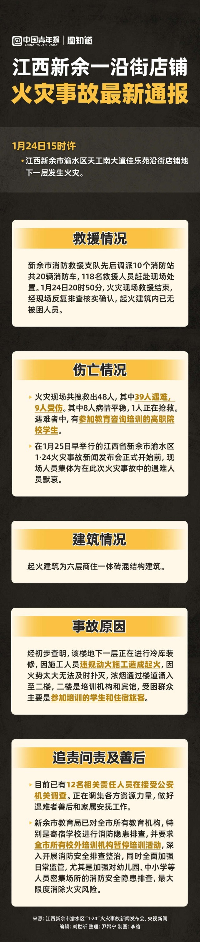 1月25日8時,江西省新余市渝水區(qū)“1·24”火災(zāi)事故新聞發(fā)布會通報,渝水區(qū)一沿街店鋪發(fā)生火災(zāi),造成39人遇難,9人受傷。遇難者中,有參加教育咨詢培訓(xùn)的高職院校學(xué)生。經(jīng)初步查明,事故原因系施工人員違規(guī)動火施工造成起火。目前,已有12名相關(guān)責(zé)任人員接受公安機關(guān)調(diào)查。此外,新余市要求全市所有校外培訓(xùn)機構(gòu)暫停培訓(xùn)活動,深入開展消防安全排查整治。