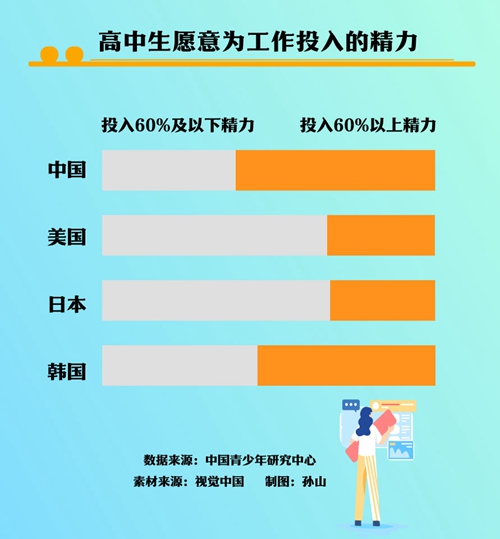 對于未來的工作,受訪高中生愿意投入多少精力?調(diào)查發(fā)現(xiàn),假設全部精力是100%,愿意為工作投入80%以上精力的中國高中生占比16.2%,愿意投入60%到80%精力的高中生占比43.8%,合計有六成受訪中國高中生愿意為工作投入60%以上精力,在四國受訪高中生中最高,其次是韓國高中生(53.3%),美國和日本高中生愿意投入60%以上精力的比例均只有三成多(32.4%和31.6%)。可見,中國和韓國高中生更愿意投入較多精力在工作上。