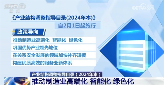 《產(chǎn)業(yè)結(jié)構(gòu)調(diào)整指導(dǎo)目錄(2024年本)》自2月1日起施行?!赌夸洠?024年本)》的政策導(dǎo)向是,推動(dòng)制造業(yè)高端化、智能化、綠色化,鞏固優(yōu)勢產(chǎn)業(yè)領(lǐng)先地位,在關(guān)系安全發(fā)展的領(lǐng)域加快補(bǔ)齊短板,構(gòu)建優(yōu)質(zhì)高效的服務(wù)業(yè)新體系。