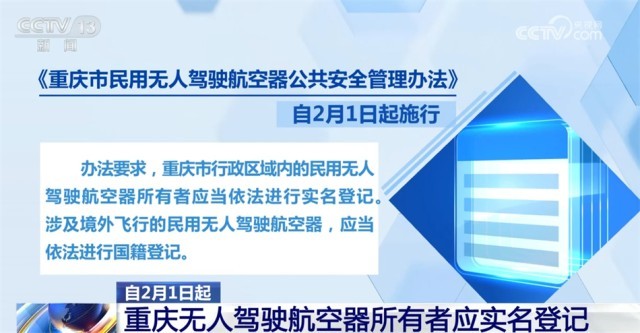 《重慶市民用無人駕駛航空器公共安全管理辦法》自2月1日起施行。辦法要求,重慶市行政區(qū)域內(nèi)的民用無人駕駛航空器所有者應(yīng)當(dāng)依法進(jìn)行實(shí)名登記。涉及境外飛行的民用無人駕駛航空器,應(yīng)當(dāng)依法進(jìn)行國籍登記。