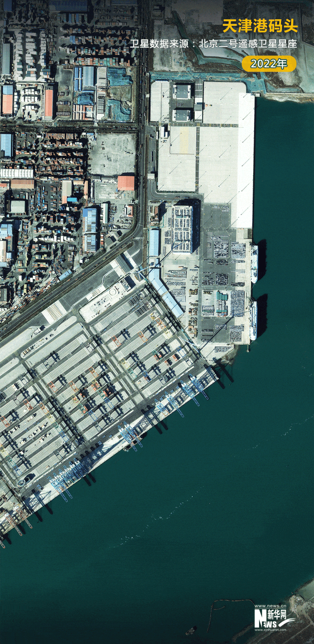 數(shù)據(jù)顯示,天津港2023年完成集裝箱吞吐量2217萬標(biāo)準(zhǔn)箱,同比增長5.5%,創(chuàng)歷史新高。衛(wèi)星見證,一批批待出口的貨物排列在天津港的碼頭上。我國外貿(mào)出口的火熱場景躍然圖上。