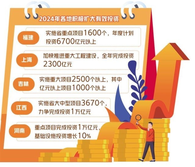 各地2024年政府工作報告中對今年如何擴大有效投資進(jìn)行了系統(tǒng)部署,不少地方還公布了具體金額。比如,福建將謀劃實施省重點項目1600個、年度計劃投資6700億元以上;上海今年將加快推進(jìn)重大工程建設(shè),全年完成投資2300億元;吉林今年計劃實施重大項目2500個以上,其中億元以上項目1000個以上;江西今年實施省大中型項目3670個,力爭完成投資1萬億元;河南重點項目完成投資1萬億元,基礎(chǔ)設(shè)施投資增長10%;安徽開展先進(jìn)制造業(yè)投資“領(lǐng)跑”計劃,制造業(yè)投資增長10%以上。