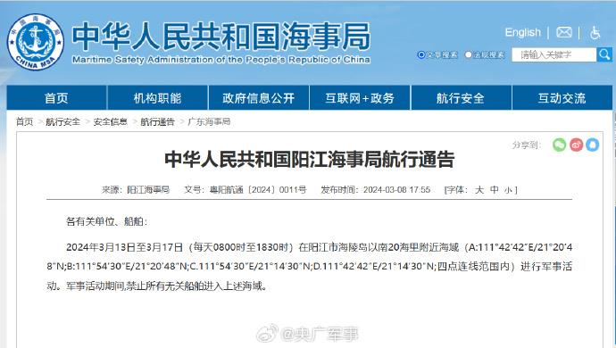 陽江海事局發(fā)布航行警告,3月13日至3月17日,每天8時至18時30分,在陽江市海陵島以南20海里附近海域進行軍事活動,禁止駛入。