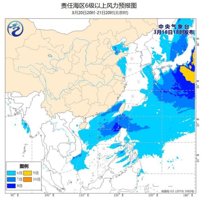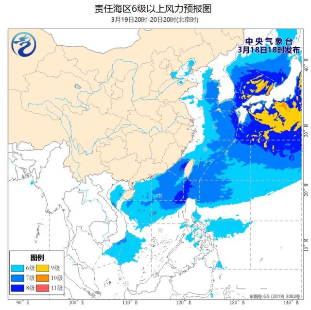 預計,19日白天至21日白天,東海南部海域、臺灣海峽、臺灣以東洋面、巴士海峽、南海大部海域、北部灣將有6~7級,陣風8級的偏北或東北風,其中臺灣海峽、巴士海峽、南海東北部部分海域風力可達8級、陣風9-10級。
