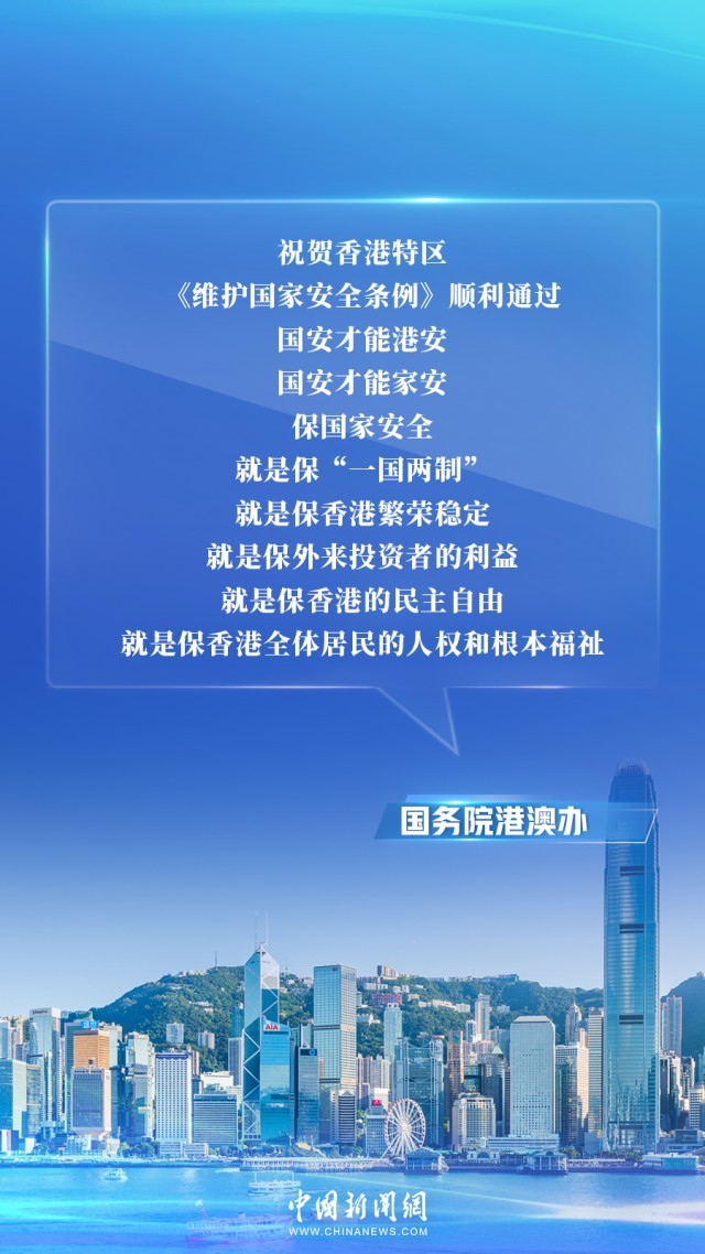 國(guó)務(wù)院港澳辦強(qiáng)調(diào),香港國(guó)安條例順利通過(guò),為保持香港長(zhǎng)期繁榮穩(wěn)定、推動(dòng)“一國(guó)兩制”實(shí)踐行穩(wěn)致遠(yuǎn)提供更加堅(jiān)實(shí)的制度保障。香港國(guó)安條例全面有效維護(hù)國(guó)家安全,充分尊重和保障人權(quán),更好統(tǒng)籌發(fā)展和安全。