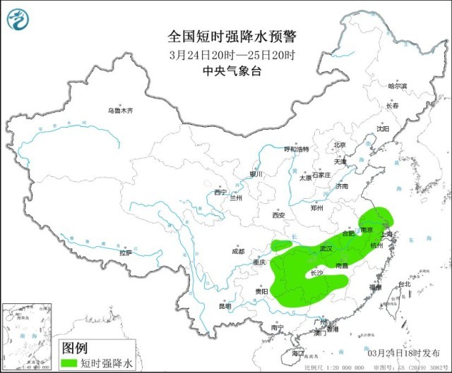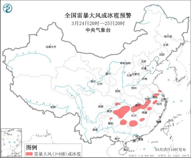 央視網(wǎng)消息:中央氣象臺3月24日18時繼續(xù)發(fā)布強對流天氣藍色預警。預計3月24日20時至25日20時,安徽中南部、江蘇中南部、湖北東部和南部、重慶東部、貴州東部、湖南北部和東南部、江西東北部和中南部、浙江西北部、廣西東北部等地的部分地區(qū)將有8-10級雷暴大風或冰雹天氣;安徽中南部、江蘇中南部、上海北部和西部、湖北東部和南部、重慶東部、貴州東部、湖南、江西、浙江西北部、廣西東北部、廣東西北部等地的部分地區(qū)將有短時強降水天氣,最大小時雨量20-40毫米,局地可達50毫米以上。