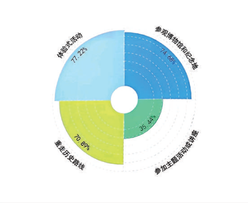 愛國主義教育入耳、入腦,更入心。此次調(diào)研中,79.75%的受訪者參與過紅色旅游,年齡主要集中在18~35歲之間。超過70%的人選擇參觀博物館和紀(jì)念地(74.68%)、重走歷史路線(70.89%)以及體驗(yàn)式活動(dòng)(77.22%)三種形式,90.87%的受訪者表示,參與紅色旅游的目的是學(xué)習(xí)歷史文化知識、接受紅色文化洗禮。