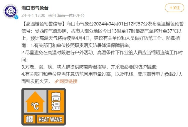 海口發(fā)布高溫橙色預(yù)警