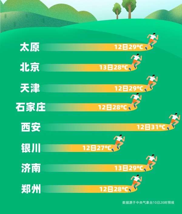 華北、黃淮、西北地區(qū)東部等地的氣溫沖勁也很猛,12日至13日氣溫將達到近期高點,山西、河南、河北等局地還可能有30℃的氣溫冒頭,暖熱程度堪比常年5、6月。