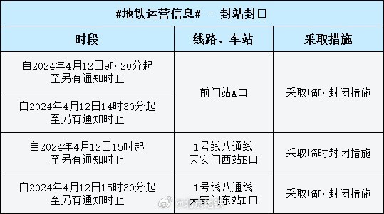 央視網(wǎng)消息:據(jù)@北京地鐵 微博消息,自2024年4月12日9時20分起至另有通知時止,前門站A口采取臨時封閉措施;自2024年4月12日14時30分起至另有通知時止,前門站A口采取臨時封閉措施;自2024年4月12日15時起至另有通知時止,1號線八通線天安門西站B口采取臨時封閉措施;自2024年4月12日15時30分起至另有通知時止,1號線八通線天安門東站D口采取臨時封閉措施。