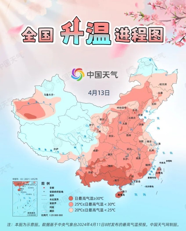 眼下,全國(guó)大部處于冷空氣影響間歇期,升溫是主旋律。預(yù)計(jì)今起三天(4月11日至13日),我國(guó)從北到南都將開(kāi)啟回暖進(jìn)程,最高氣溫25℃以上的區(qū)域幾乎覆蓋整個(gè)中東部,波及20余省份,東北、西北地區(qū)氣溫將大面積創(chuàng)今年以來(lái)新高,北方不少地方還會(huì)體驗(yàn)到常年5月中旬才有的超前暖熱。中國(guó)天氣網(wǎng)推出全國(guó)升溫進(jìn)程圖,看看哪些地方將沖擊30℃。
