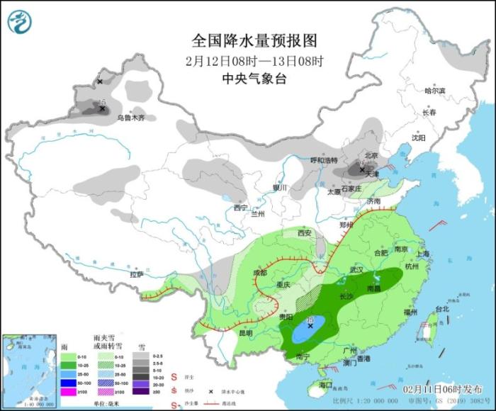 2月11日8時(shí)至12日8時(shí),內(nèi)蒙古中東部、東北地區(qū)北部、新疆沿天山地區(qū)和南疆盆地、西藏東部、青海北部和東部、甘肅中東部、寧夏南部、陜西西南部、川西高原等地部分地區(qū)有小到中雪,其中,黑龍江東南部、西藏東南部等地部分地區(qū)有大雪(5~8毫米)。江淮大部、江漢東部、江南、西南地區(qū)東部、華南大部、臺(tái)灣島大部等地部分地區(qū)有小到中雨。內(nèi)蒙古中部、西藏北部等地部分地區(qū)有4~6級(jí)風(fēng)。