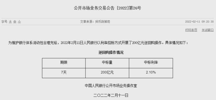 中新財(cái)經(jīng)2月11日電 為維護(hù)銀行體系流動性合理充裕,2022年2月11日人民銀行以利率招標(biāo)方式開展了200億元逆回購操作。中標(biāo)利率2.1%,與此前持平。