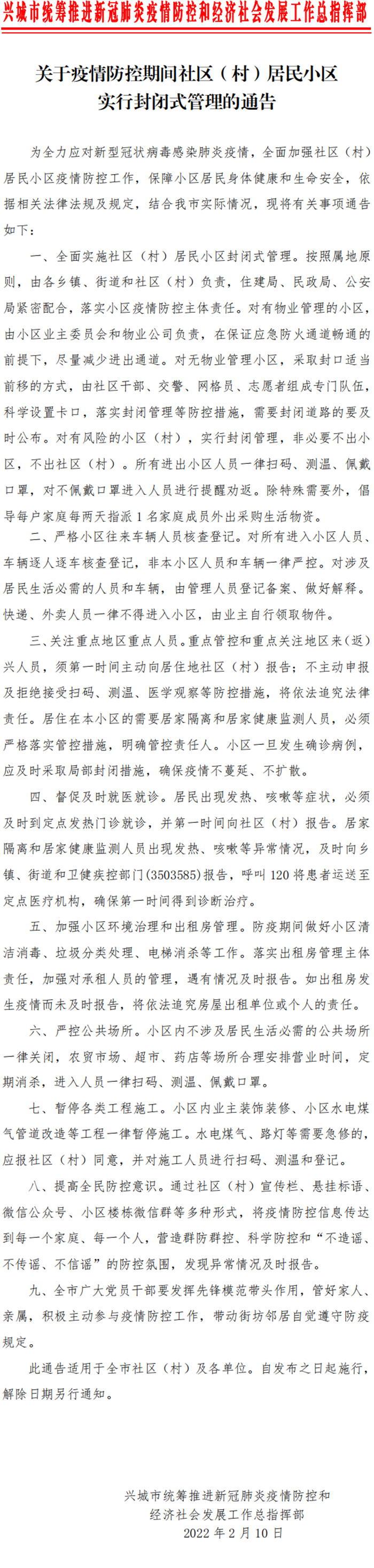 中新網(wǎng)2月11日電 據(jù)興城市政府網(wǎng)站消息,遼寧葫蘆島興城市統(tǒng)籌推進(jìn)新冠肺炎疫情防控和經(jīng)濟(jì)社會(huì)發(fā)展工作總指揮部10日發(fā)布通知,即日起,全面實(shí)施社區(qū)(村)居民小區(qū)封閉式管理,對(duì)有風(fēng)險(xiǎn)的小區(qū)(村),實(shí)行封閉管理,非必要不出小區(qū),不出社區(qū)(村)。