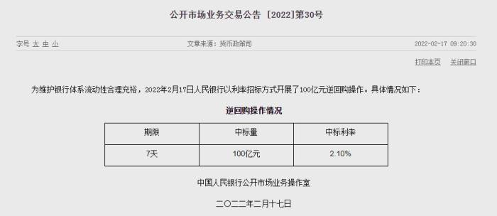 中新財(cái)經(jīng)2月17日電 17日,據(jù)中國人民銀行官網(wǎng)消息,為維護(hù)銀行體系流動性合理充裕,2022年2月17日人民銀行以利率招標(biāo)方式開展了100億元逆回購操作,期限為7天,中標(biāo)利率為2.10%。(完)