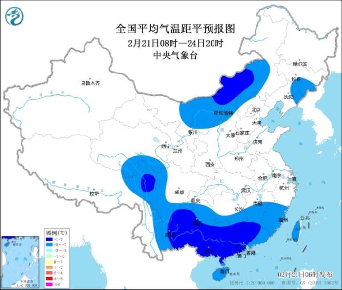 受持續(xù)陰雨雪和冷空氣共同影響,我國(guó)南方大部地區(qū)氣溫將顯著偏低。預(yù)計(jì)21日08時(shí)至24日20時(shí),貴州、四川西部和南部、湖南南部、江西中南部、云南東部、廣西、廣東、福建、海南和臺(tái)灣島等地的日平均氣溫較歷史同期偏低5℃以上,其中,云南東部、貴州南部、湖南南部、江西南部、廣西大部、廣東中西部等地偏低7℃以上,最低氣溫0℃線(xiàn)將壓至貴州南部、湖南南部、江西北部到浙江南部一帶,4℃線(xiàn)將壓至廣西中部到廣東中部一帶。另外,內(nèi)蒙古中部、吉林、青藏高原東部等地日平均氣溫也較歷史同期偏低5℃,部分地區(qū)偏低7℃。(見(jiàn)圖1、圖2)。