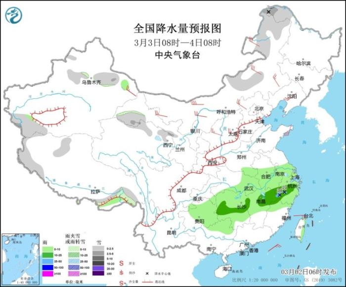 全國降水量預(yù)報圖(3月2日08時-3日08時)