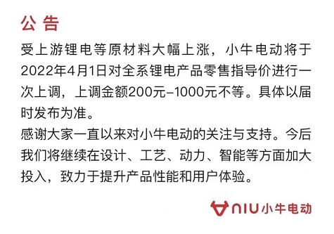 中新財經3月21日電 21日,小牛電動發(fā)布公告稱,受上游鋰電等原材料價格大幅上漲,小牛電動將于2022年4月1日對全系鋰電產品零售指導價進行一次上調,上調金額200-1000元不等,具體以屆時發(fā)布為準。(完)