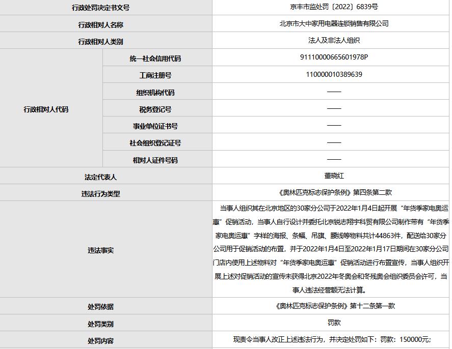 行政處罰書顯示,當事人自行設計并委托北京銳志翔宇科貿(mào)有限公司制作帶有“年貨季家電奧運惠”字樣的海報、條幅、吊旗、腰線等物料共計44863件,配送給30家分公司用于促銷活動的布置,并于2022年1月4日至2022年1月17日期間在30家分公司門店內(nèi)使用上述物料對“年貨季家電奧運惠”促銷活動進行布置宣傳,當事人組織開展上述對促銷活動的宣傳未獲得北京2022年冬奧會和冬殘奧會組織委員會許可,當事人違法經(jīng)營額無法計算。(完)