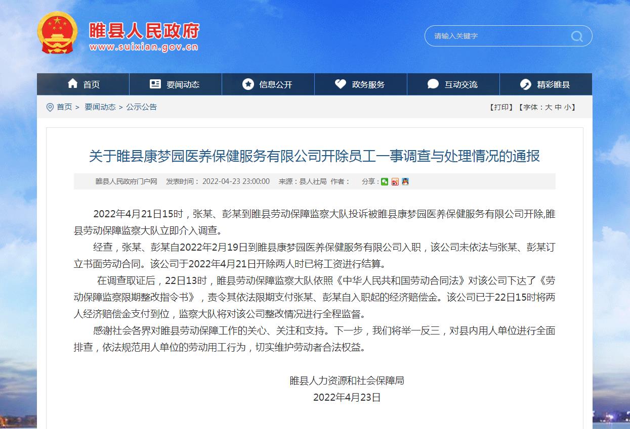 通報稱,4月21日15時,張某、彭某到睢縣勞動保障監(jiān)察大隊投訴被睢縣康夢園醫(yī)養(yǎng)保健服務(wù)有限公司開除,睢縣勞動保障監(jiān)察大隊立即介入調(diào)查。