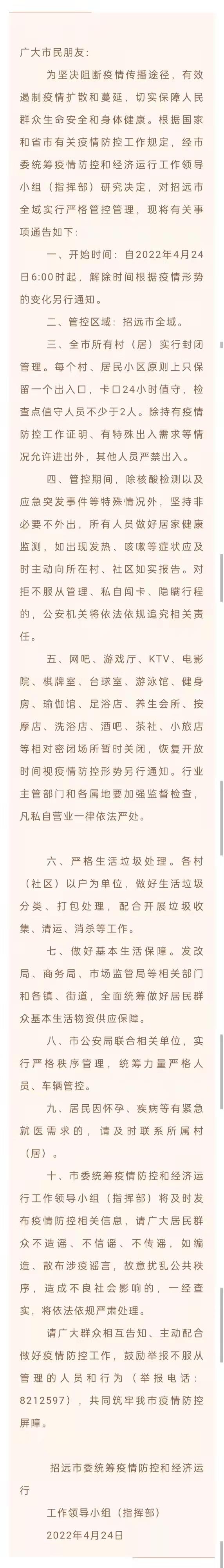 4月24日,山東煙臺招遠(yuǎn)市委統(tǒng)籌疫情防控和經(jīng)濟(jì)運(yùn)行工作領(lǐng)導(dǎo)小組(指揮部)發(fā)布《關(guān)于全域?qū)嵤﹪?yán)格管控管理的通告》。通告指出,自2022年4月24日6時起,招遠(yuǎn)市所有村(居)實行封閉管理。每個村、居民小區(qū)原則上只保留一個出入口,卡口24小時值守,檢查點值守人員不少于2人。除持有疫情防控工作證明、有特殊出入需求等情況允許進(jìn)出外,其他人員嚴(yán)禁出入。