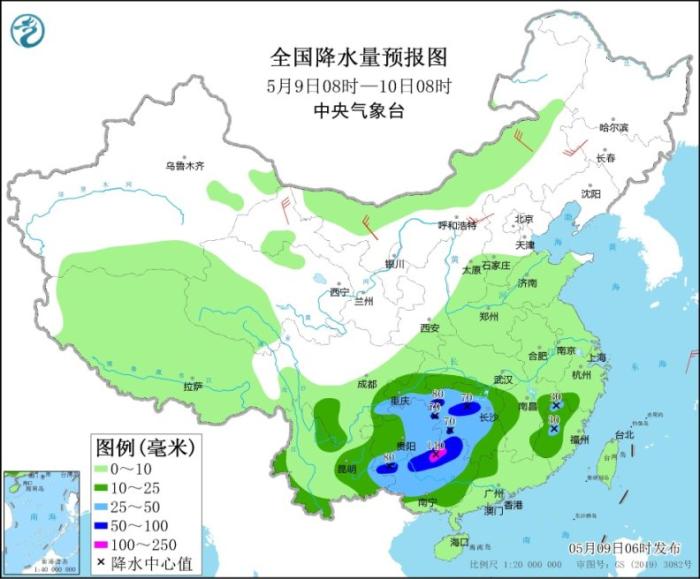 5月9日08時至10日08時,西南地區(qū)東部和南部、江南西部、華南北部和西部等地部分地區(qū)有中到大雨,其中,湖南中西部、重慶東南部、貴州東南部、廣西北部等地部分地區(qū)有暴雨或大暴雨(100~140毫米)。甘肅河西、內(nèi)蒙古大部、東北地區(qū)等地部分地區(qū)有4~6級風。