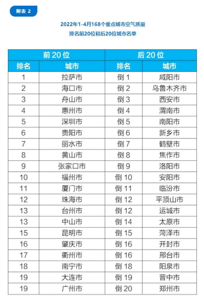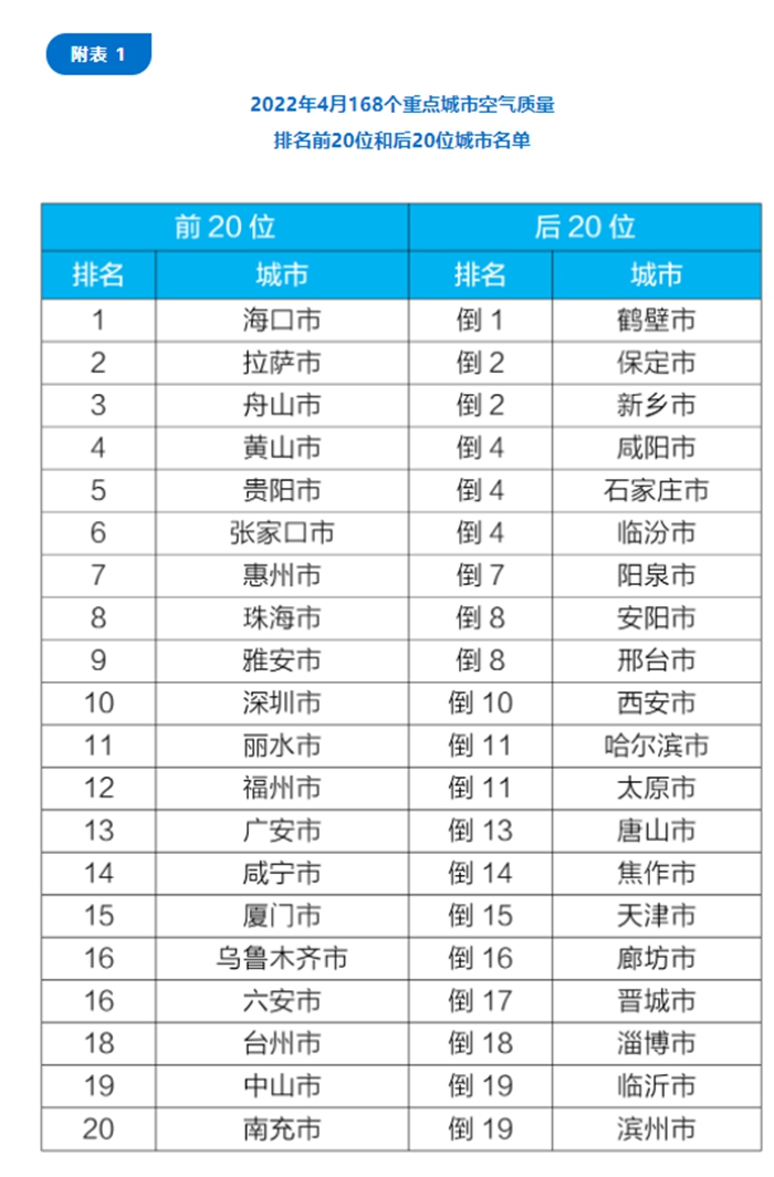 在重點城市排名中,4月,168個重點城市中,??凇⒗_和舟山市等20個城市空氣質(zhì)量相對較好;鶴壁、保定和新鄉(xiāng)市等20個城市空氣質(zhì)量相對較差。