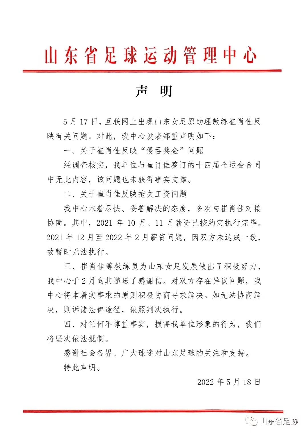 三、崔肖佳等教練員為山東女足發(fā)展做出了積極努力,我中心于2月向其遞送了感謝信。對雙方存在異議問題,我中心將本著實事求是的原則積極協(xié)商尋求解決。如無法協(xié)商解決,則訴諸法律途徑,依照判決執(zhí)行。