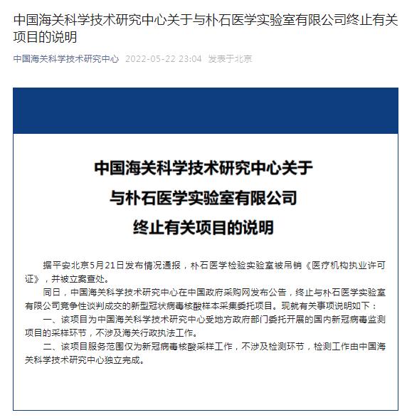 中國海關(guān)科學技術(shù)研究中心終止與樸石醫(yī)學實驗室有關(guān)項目