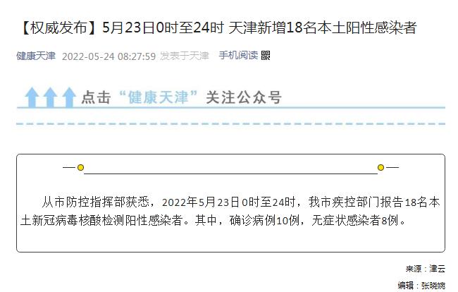 中新網(wǎng)5月24日電 據(jù)天津衛(wèi)健委官方微信消息,從天津市防控指揮部獲悉,2022年5月23日0時(shí)至24時(shí),天津市疾控部門報(bào)告18名本土新冠病毒核酸檢測(cè)陽性感染者。其中,確診病例10例,無癥狀感染者8例。