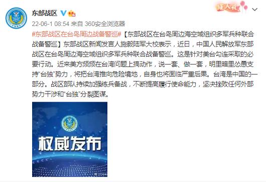 中新網(wǎng)6月1日電 據(jù)中國人民解放軍東部戰(zhàn)區(qū)官方微博1日消息,東部戰(zhàn)區(qū)新聞發(fā)言人施毅陸軍大校表示,近日,中國人民解放軍東部戰(zhàn)區(qū)在臺(tái)島周邊??沼蚪M織多軍兵種聯(lián)合戰(zhàn)備警巡。這是針對(duì)美臺(tái)勾連采取的必要行動(dòng)。近來美方頻頻在臺(tái)灣問題上搞動(dòng)作,說一套、做一套,明里暗里慫恿支持“臺(tái)獨(dú)”勢力,將把臺(tái)灣推向危險(xiǎn)境地,自身也將面臨嚴(yán)重后果。臺(tái)灣是中國的一部分。戰(zhàn)區(qū)部隊(duì)持續(xù)加強(qiáng)練兵備戰(zhàn),不斷提高履行使命能力,堅(jiān)決挫敗任何外部勢力干涉和“臺(tái)獨(dú)”分裂圖謀。