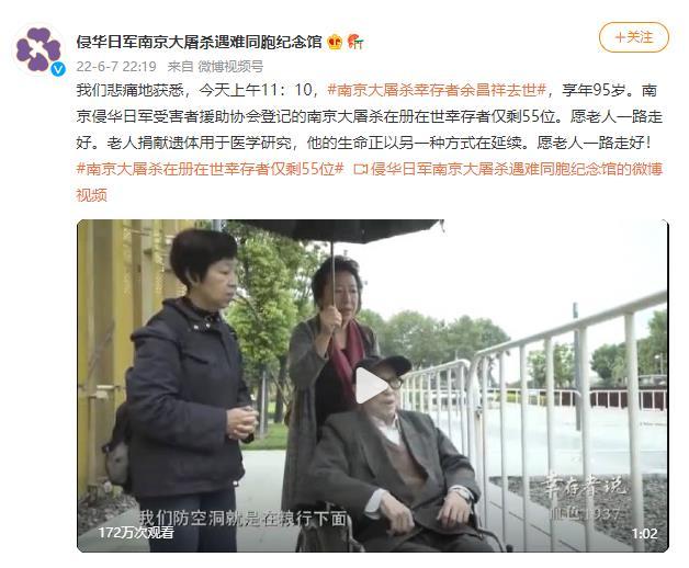 中新網(wǎng)6月8日電 據(jù)侵華日軍南京大屠殺遇難同胞紀(jì)念館官方微博消息,6月7日上午11時(shí)10分,南京大屠殺幸存者余昌祥去世,享年95歲。南京侵華日軍受害者援助協(xié)會登記的南京大屠殺在冊在世幸存者僅剩55位。