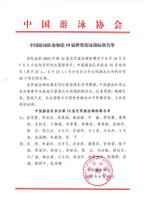 中新網(wǎng)客戶端北京6月10日電 6月10日,中國游泳協(xié)會網(wǎng)站公布了中國游泳隊參加國際泳聯(lián)2022年第19屆世界游泳錦標賽名單,奧運冠軍張雨霏、汪順領(lǐng)銜出戰(zhàn)。