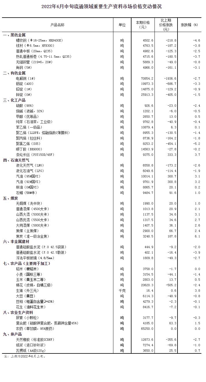 中新財(cái)經(jīng)6月24日電 6月24日,國家統(tǒng)計(jì)局發(fā)布6月中旬流通領(lǐng)域重要生產(chǎn)資料市場價(jià)格變動(dòng)情況。對(duì)全國流通領(lǐng)域9大類50種重要生產(chǎn)資料市場價(jià)格的監(jiān)測顯示,2022年6月中旬與6月上旬相比,18種產(chǎn)品價(jià)格上漲,30種下降,2種持平。其中,生豬(外三元)價(jià)格為16.4元/千克,與上期價(jià)格相比,每公斤上漲0.6元,上漲幅度為3.8%。(完)