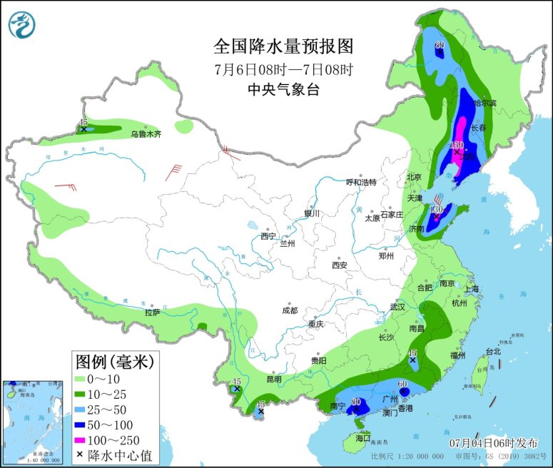 7月6日08時至7日08時,內(nèi)蒙古東部、黑龍西南部、吉林中西部、遼寧大部、河北東北部、山東、江南東部、華南大部、云南南部等地的部分地區(qū)有中到大雨,其中,遼寧大部、吉林西部、黑龍江西南部、山東中北部、廣西東南部、廣東中部和西南部等地的部分地區(qū)有暴雨或大暴雨(100~150毫米)。新疆東部和南疆盆地、內(nèi)蒙古中西部、甘肅西部、東北地區(qū)中南部、山東半島、江南東部等地的部分地區(qū)有4~6級風,其中,新疆東部、浙江東部等地的部分地區(qū)風力可達7級以上;渤海有5~7級、陣風8級的偏北風,渤海海峽、黃海北部海域有6~7級、陣風8級的東南風轉偏南風,黃海中部和南部海域、東海大部海域有5~6級、陣風7級的偏南到西南風。
