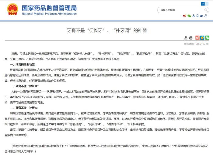 - “促長牙”“補牙洞”牙膏靠譜嗎?國家藥監(jiān)局這樣說