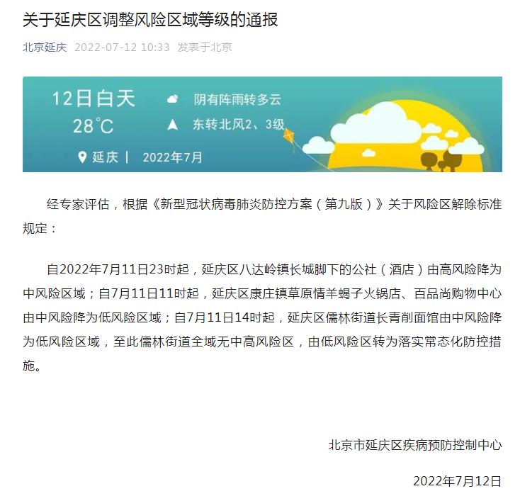 中新網(wǎng)7月12日電 據(jù)“北京延慶”微信公眾號消息,北京市延慶區(qū)疾病預(yù)防控制中心12日發(fā)布通報稱,經(jīng)專家評估,根據(jù)《新型冠狀病毒肺炎防控方案(第九版)》關(guān)于風(fēng)險區(qū)解除標(biāo)準(zhǔn)規(guī)定:自2022年7月11日23時起,延慶區(qū)八達(dá)嶺鎮(zhèn)長城腳下的公社(酒店)由高風(fēng)險降為中風(fēng)險區(qū)域;自7月11日11時起,延慶區(qū)康莊鎮(zhèn)草原情羊蝎子火鍋店、百品尚購物中心由中風(fēng)險降為低風(fēng)險區(qū)域;自7月11日14時起,延慶區(qū)儒林街道長青削面館由中風(fēng)險降為低風(fēng)險區(qū)域,至此儒林街道全域無中高風(fēng)險區(qū),由低風(fēng)險區(qū)轉(zhuǎn)為落實常態(tài)化防控措施。