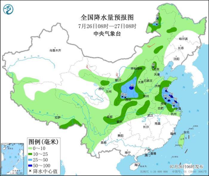 圖2 全國降水量預報圖(7月26日08時-27日08時)